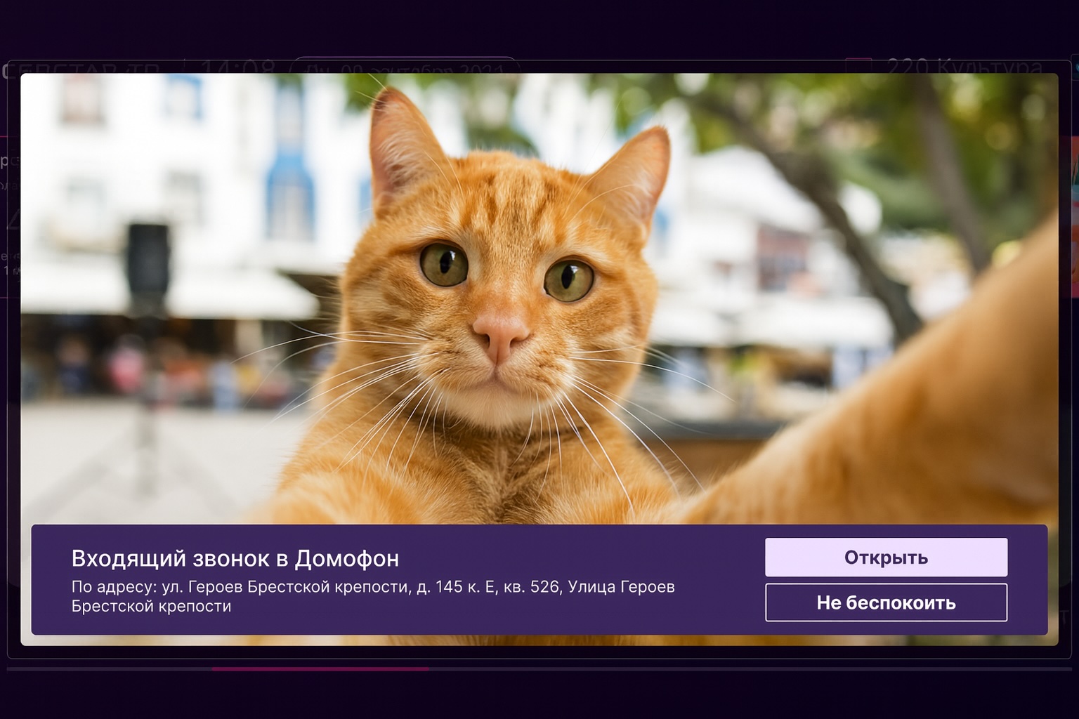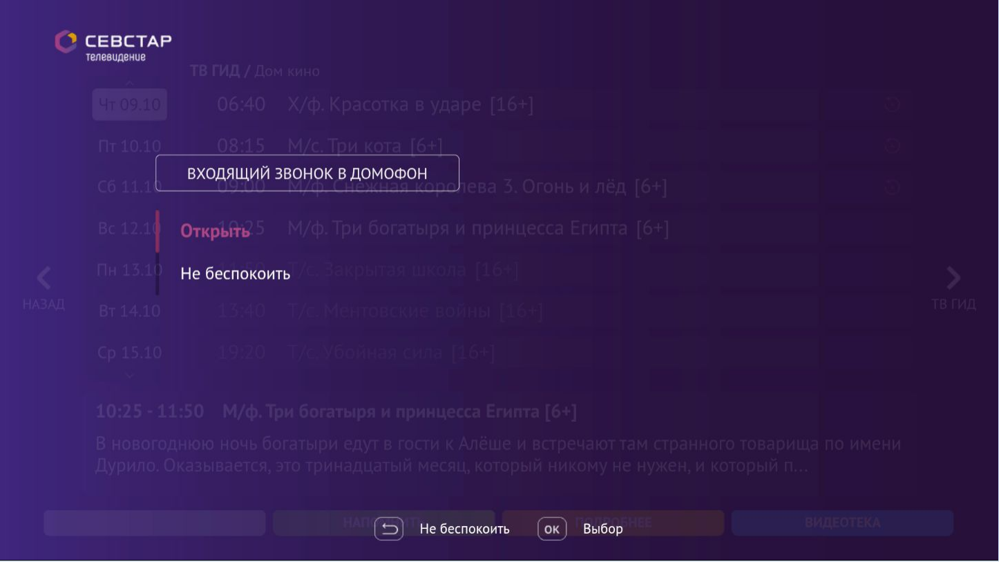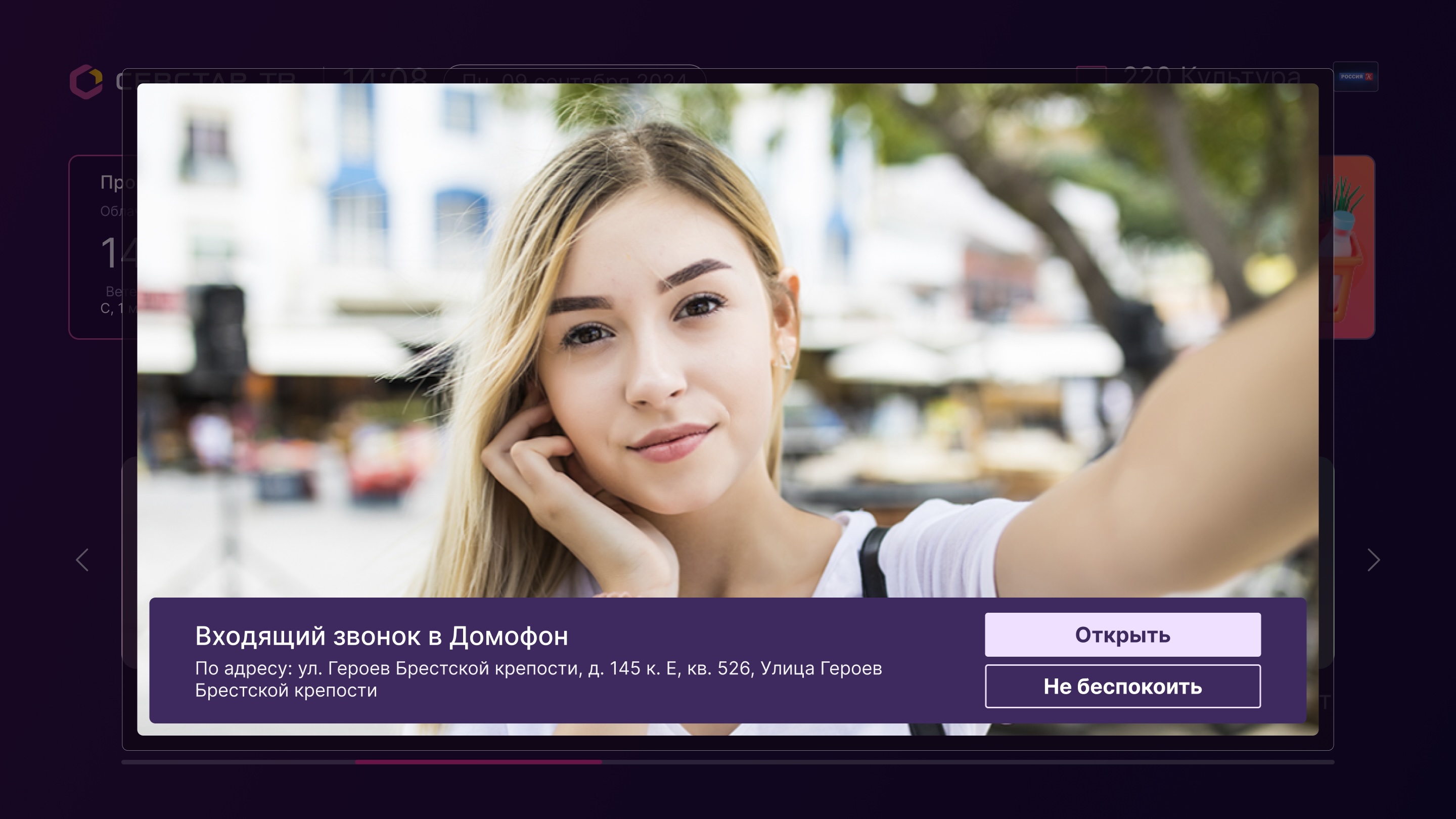 2. Сообщение с помощью Windycast будет доставлено на устройство и показано абоненту на телевизоре. Отображение видеоряда доступно только в интерфейсе Sevstar X и достигается благодаря обновлению текущего кадра с камеры домофона по таймеру (image_url). В интерфейсах Sevstar и Futuristic звонок поступает без видеоряда.